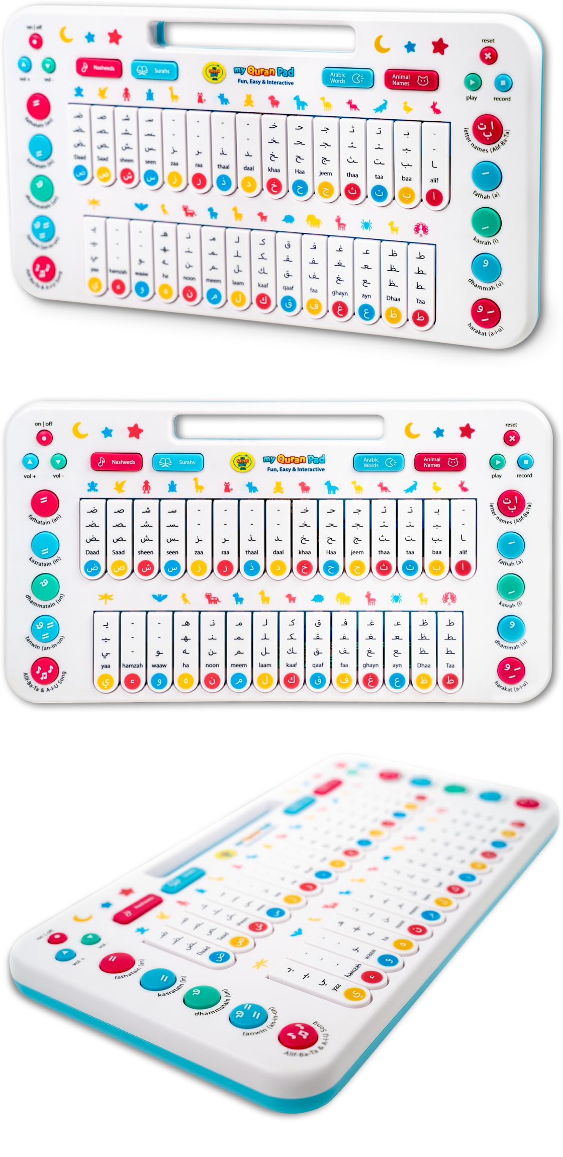 The Quran Pad includes touch sensitive keys, teaching the main Arabic vowels, Surahs, Arabic animal names, and Arabic words all in one place. It covers all 4 of the main learning styles at once: visual, kinesthetic, audio and text, and allows a child to learn intuitively through play.