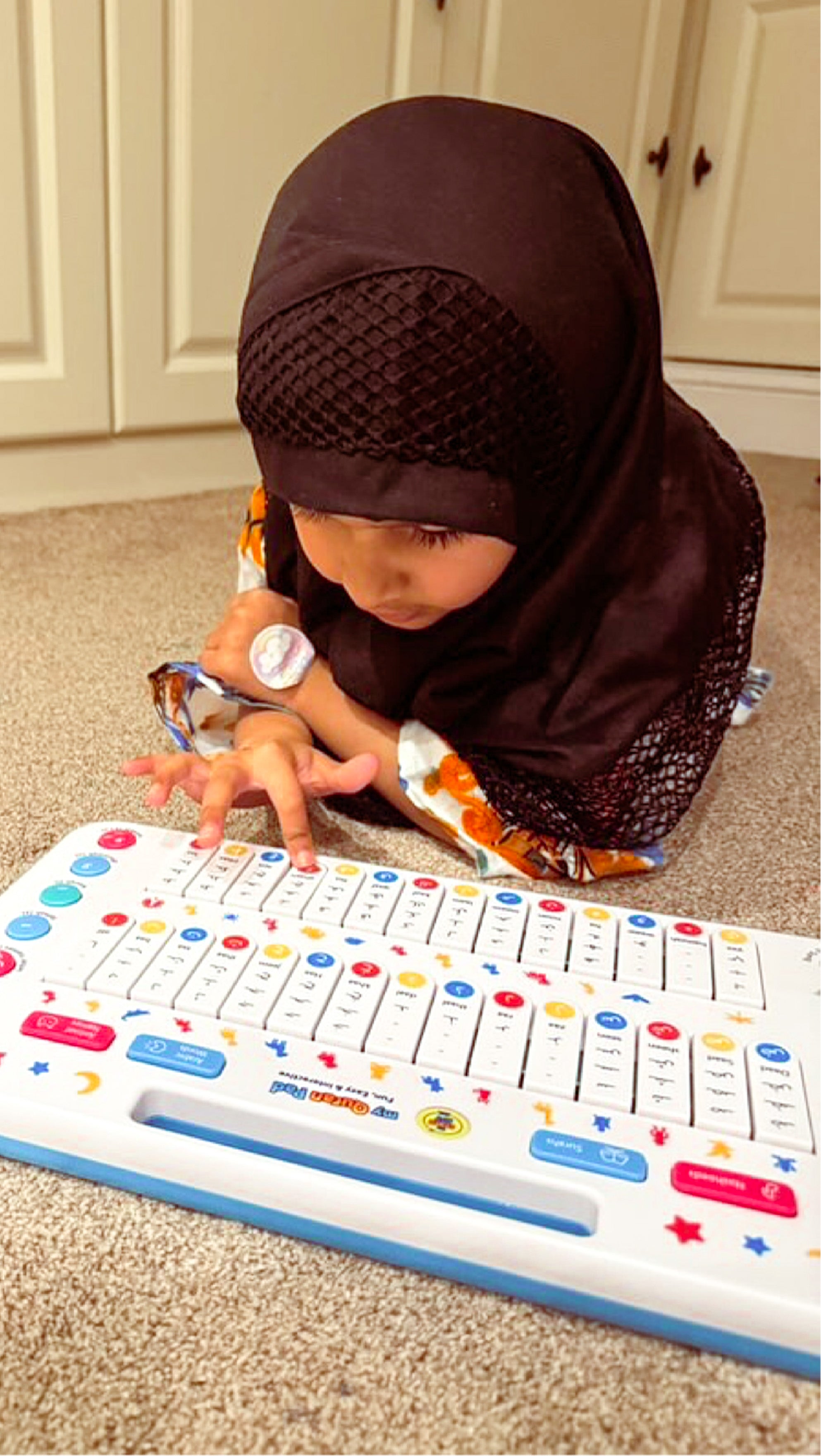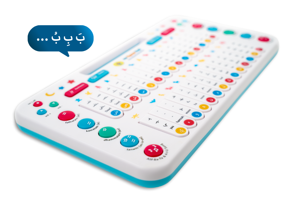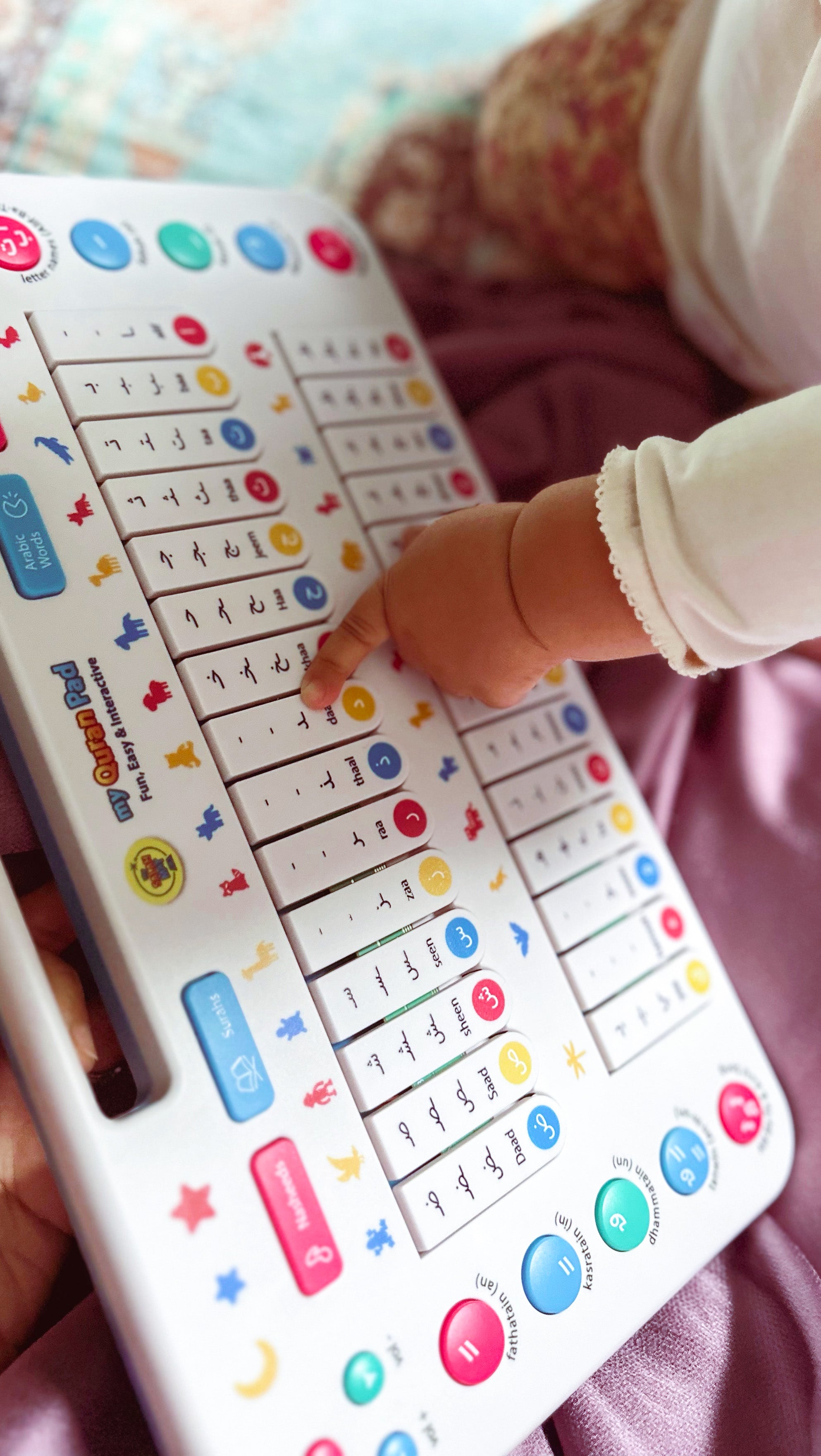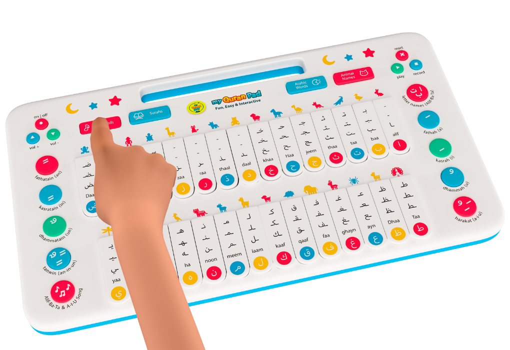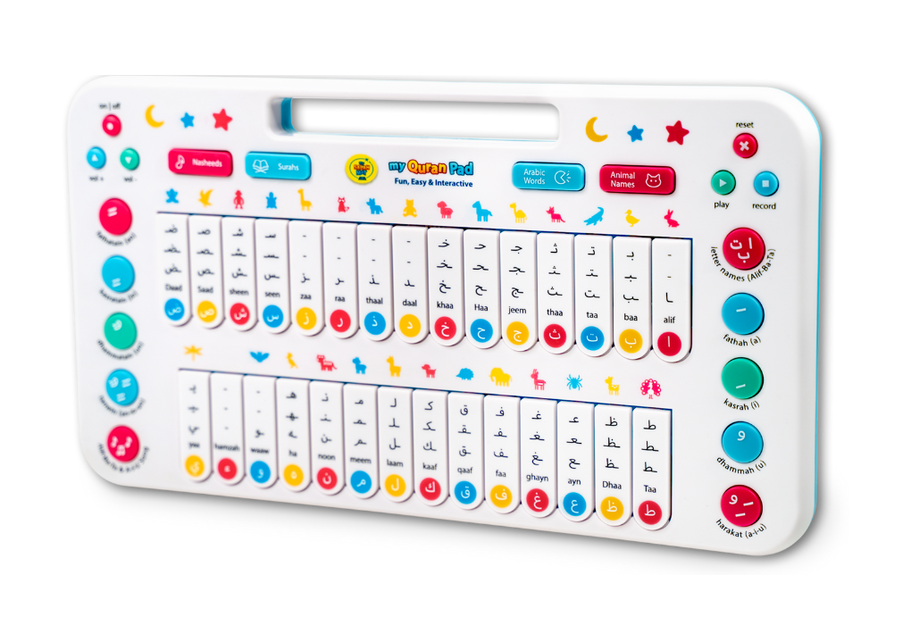 This is the Quran Pad Press to hear Arabic letters, words, animals, Surahs, and nasheeds, perfect for ages 18 months and up.