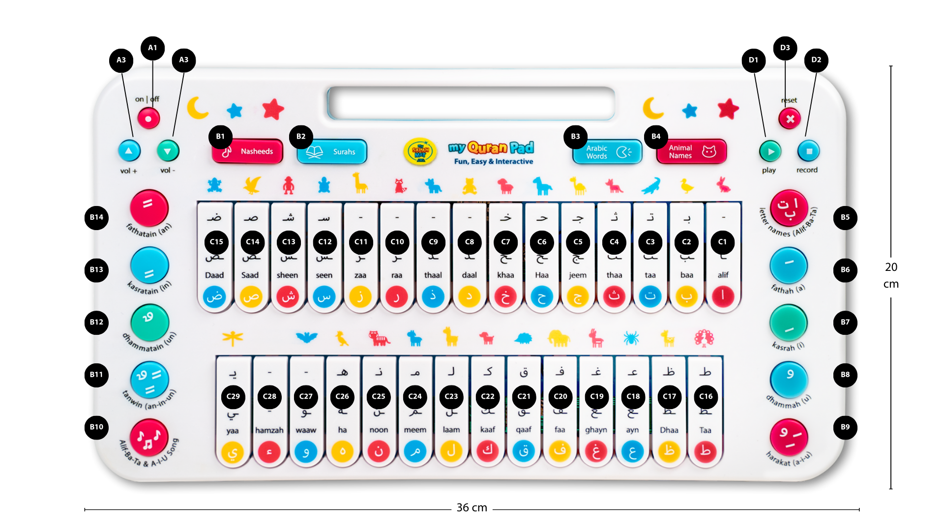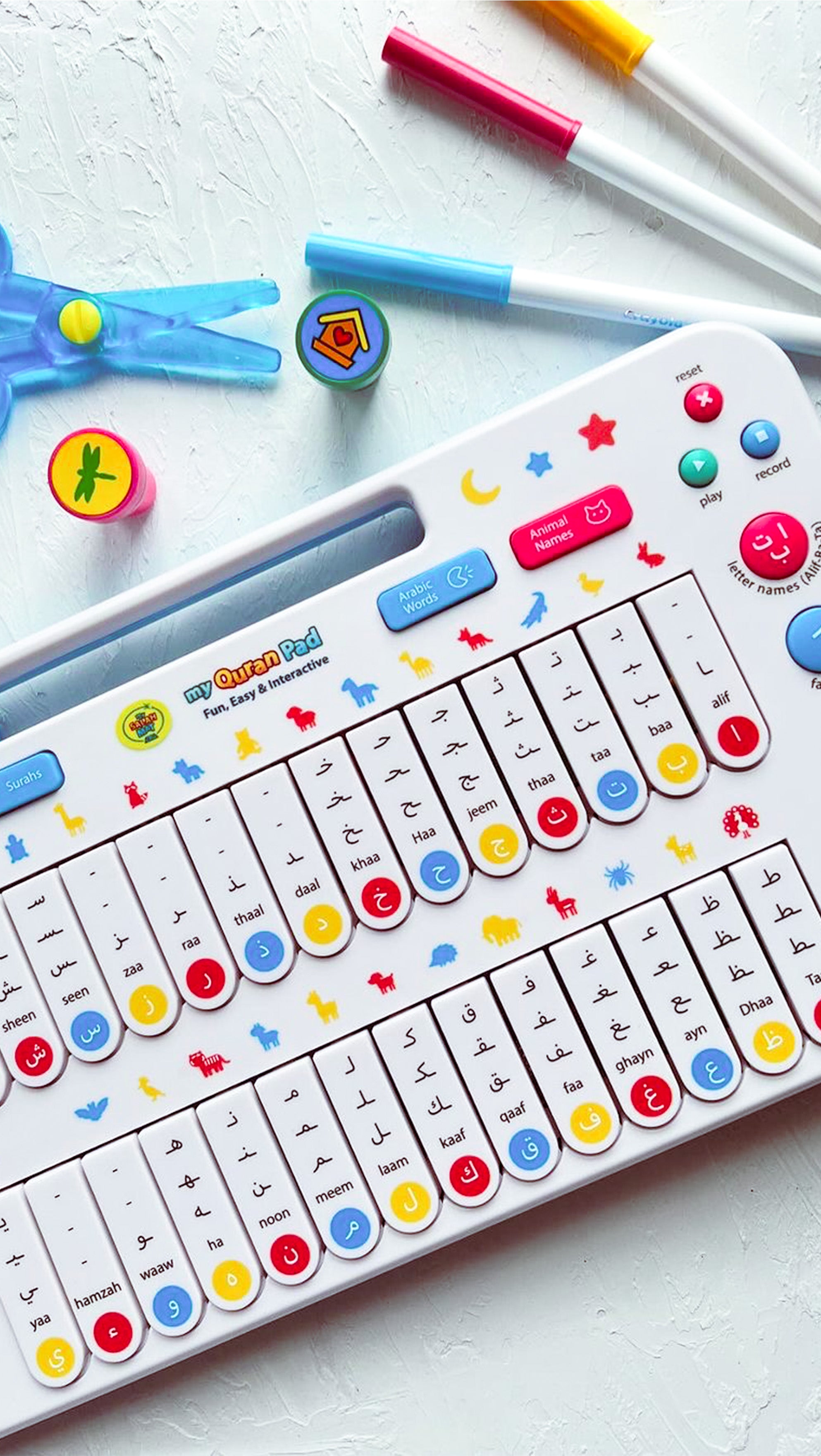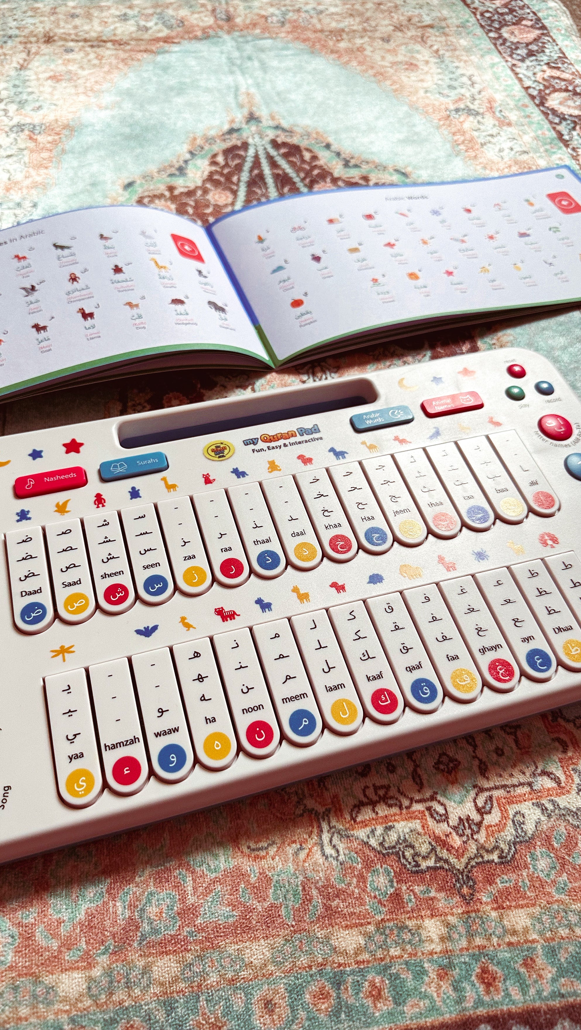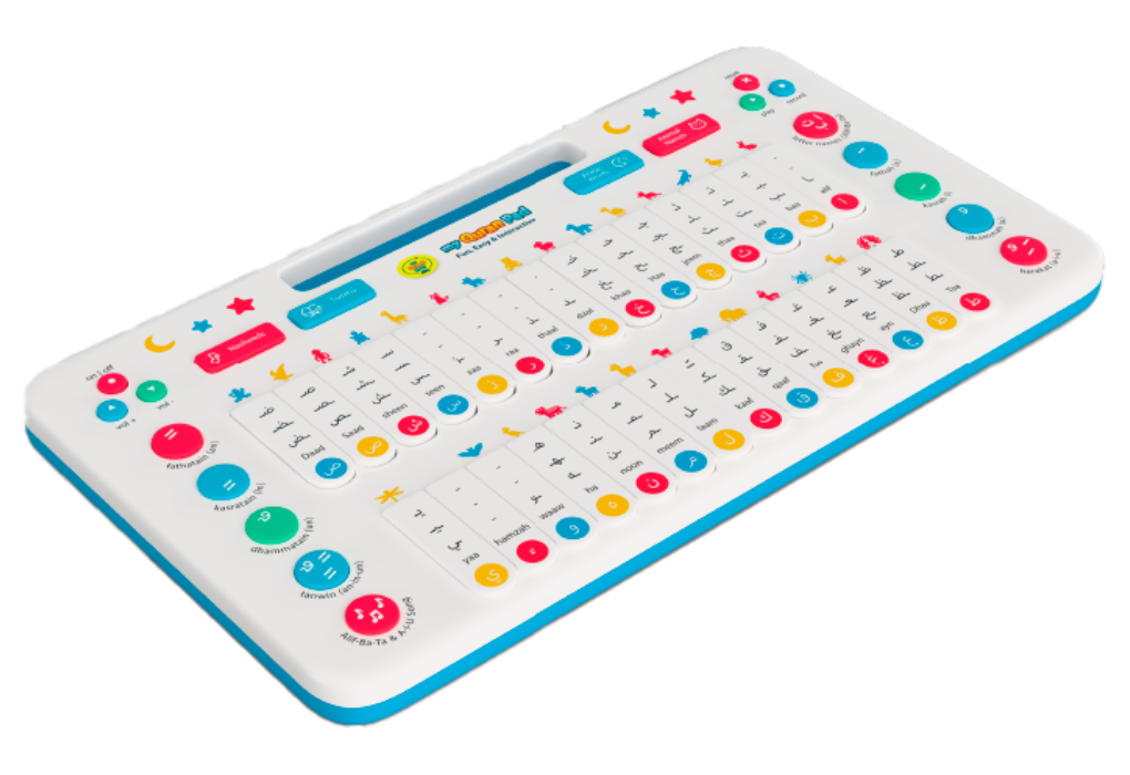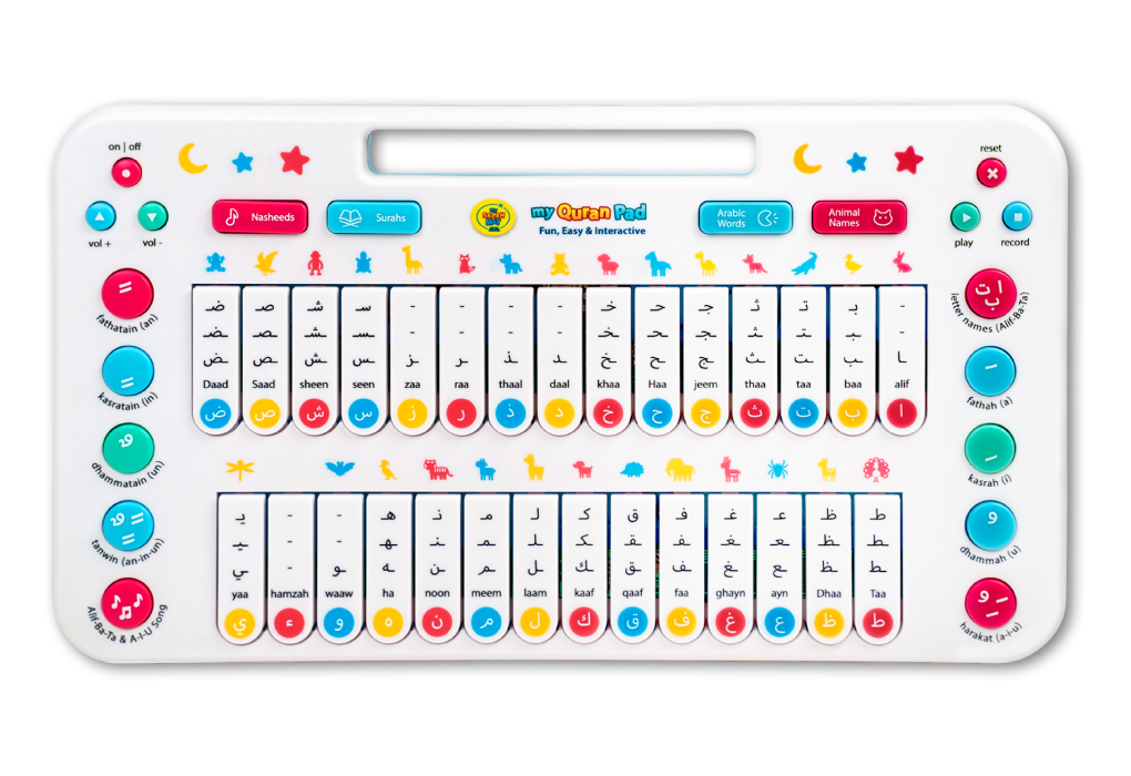 The pad features 49 touch-activated keys for learning the Arabic alphabet, daily words, animal names, short Surahs, and more. It also includes a recording and playback function.