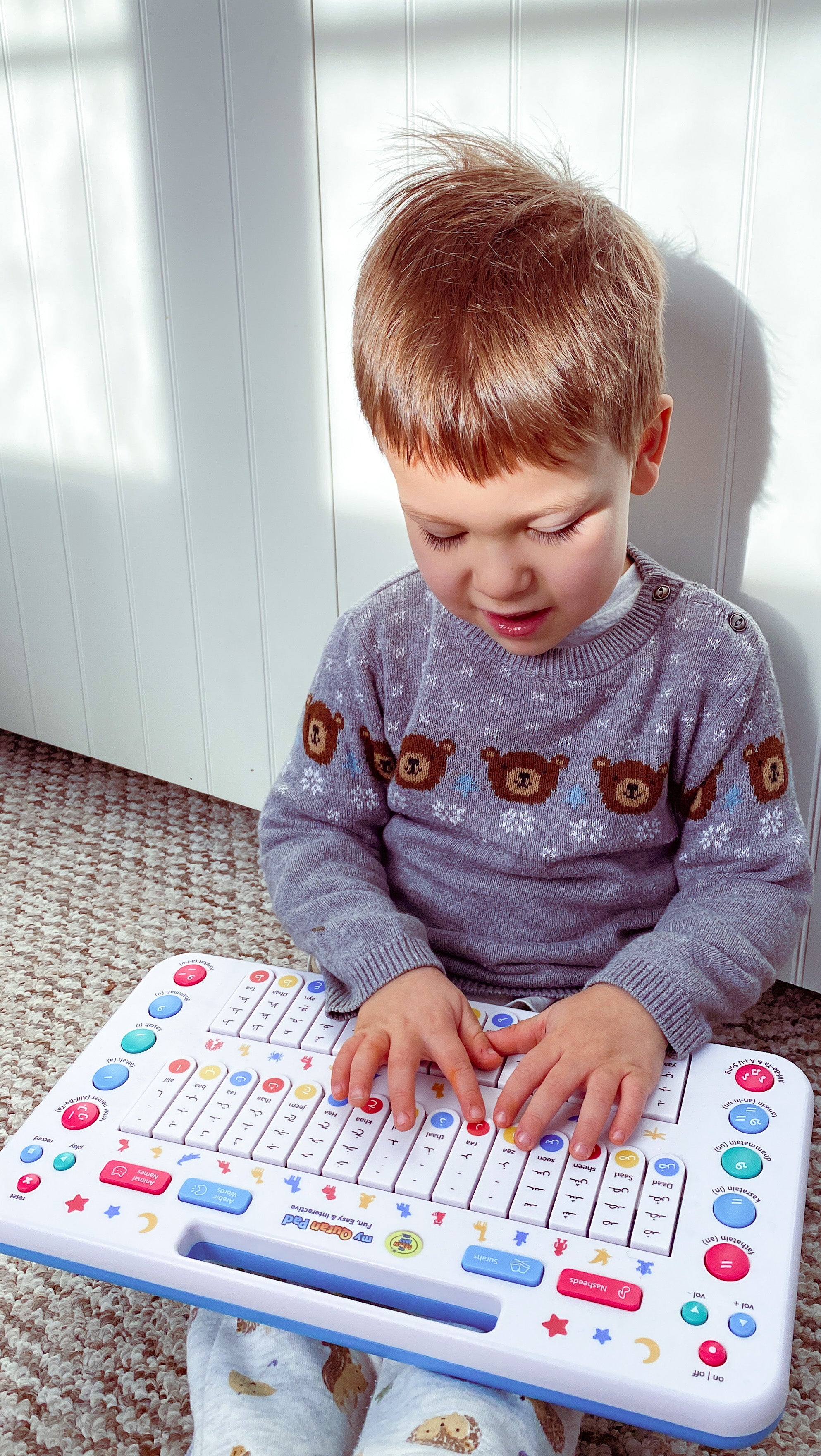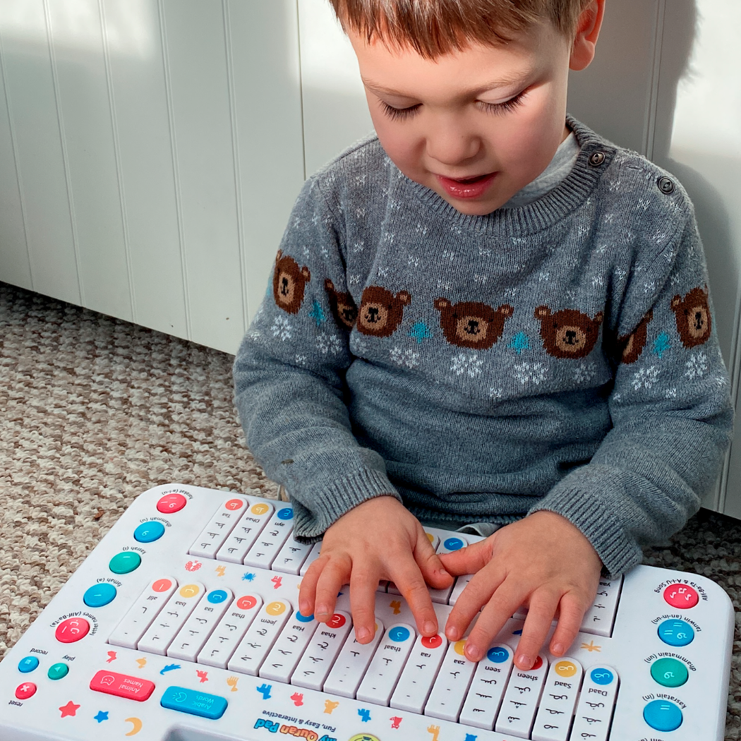 The Quran Pad teaches Arabic letters, vowels, words, animals, and Surahs through touch, sound, and play— supporting all learning styles without screens. A hands-on way to build lifelong Quranic connection.