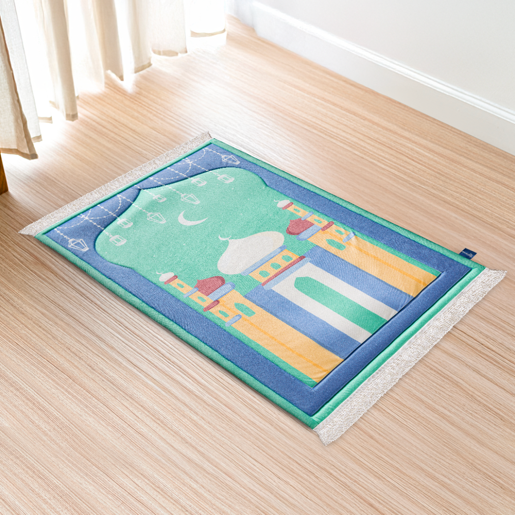 Padded Kids Prayer Mat with Aqua Mumbai Mosque Design by Urban Rugs UK | A beautiful Ramadan & Eid Gift for Loved Ones