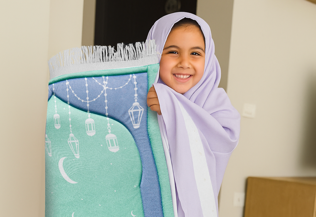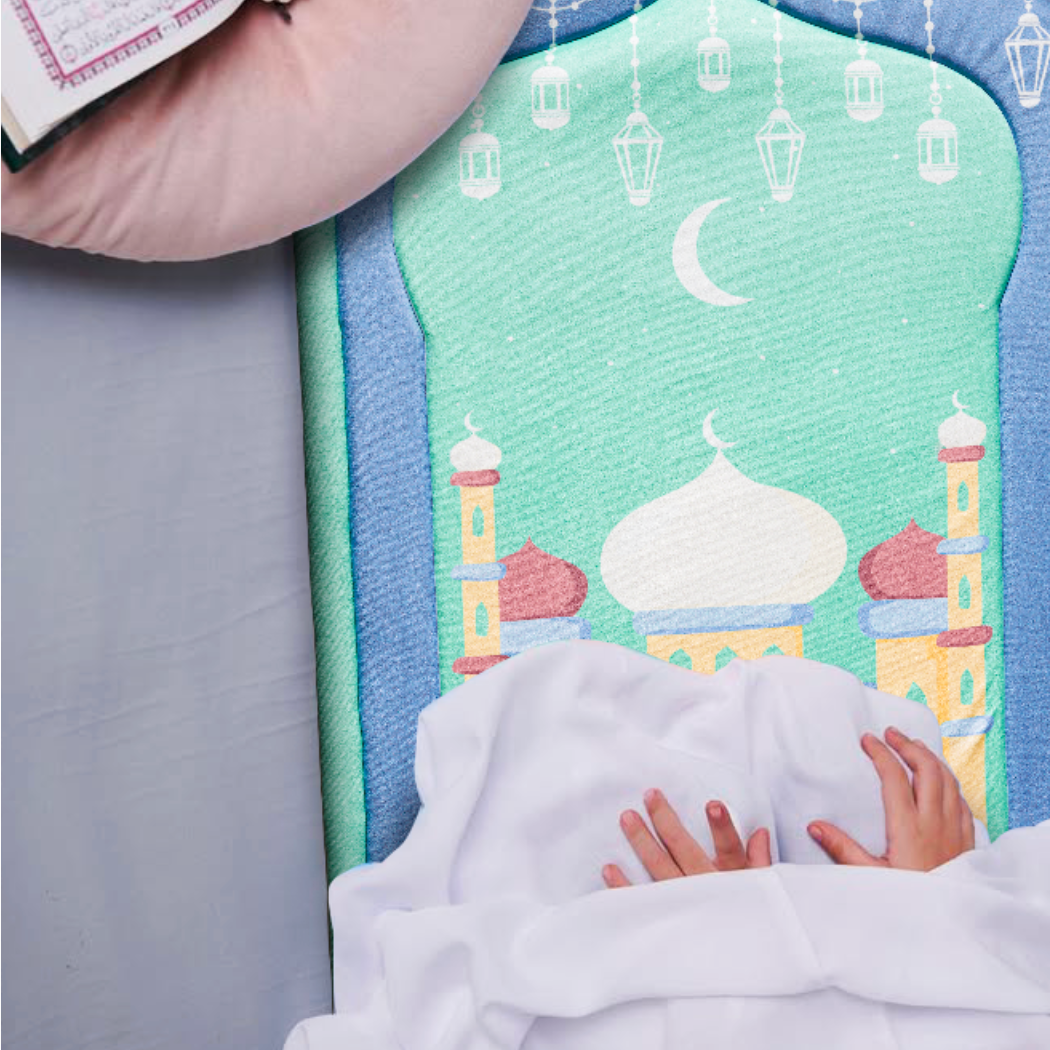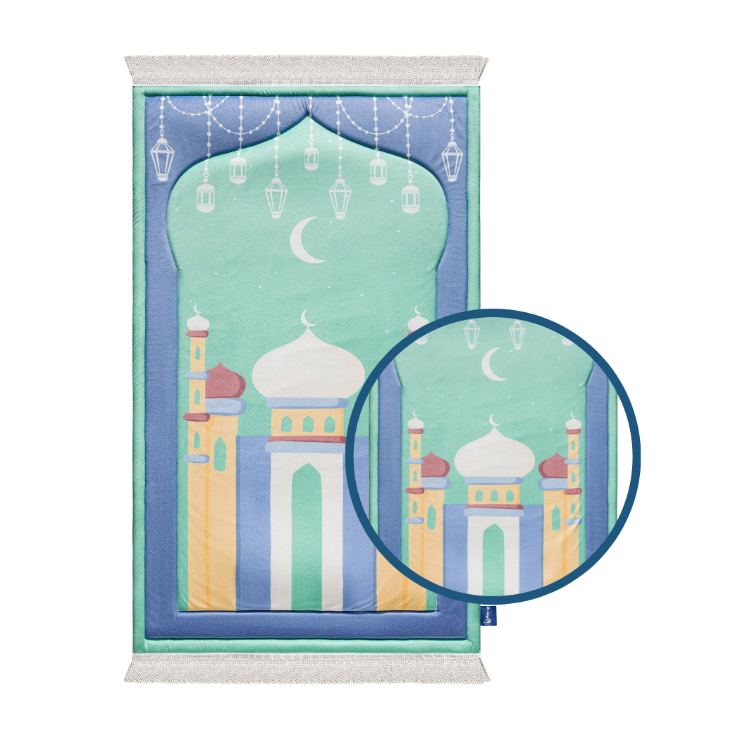 Inspired by vibrant Islamic architecture, this mat features refreshing aqua tones and a cute mosque illustration that brings energy and warmth to any kids’ prayer corner. Soft, cushioned, and delightfully colourful — perfect for sparking their enthusiasm for Salah.