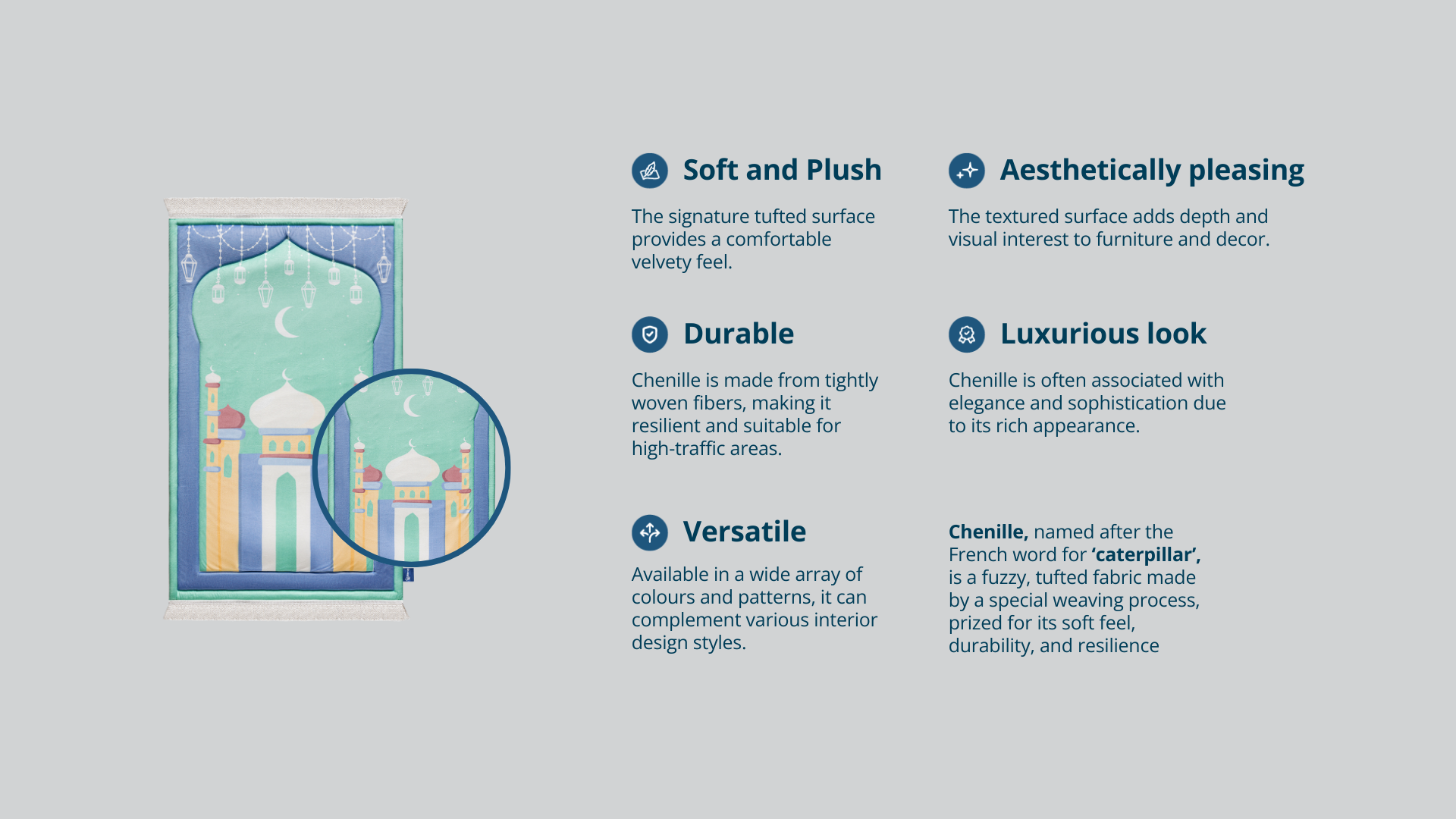 Velvety-smooth chenille adds luxury and softness, enhancing both comfort and elegance in your daily prayer.