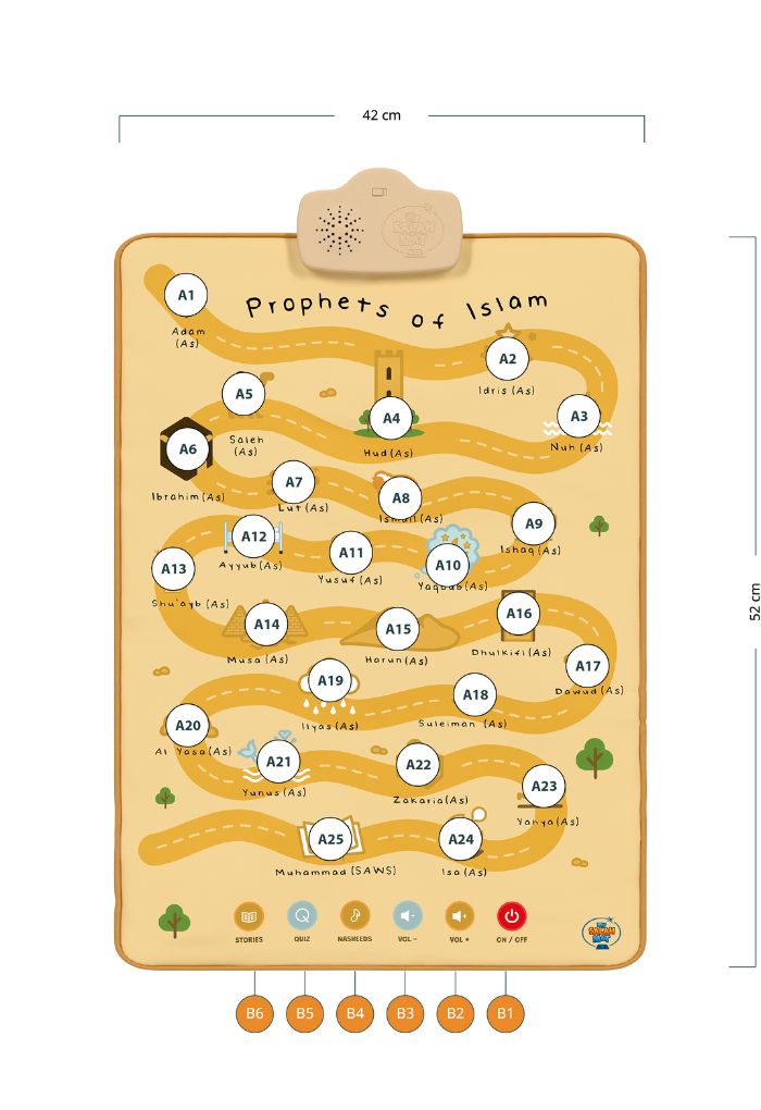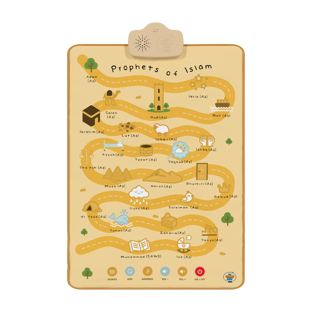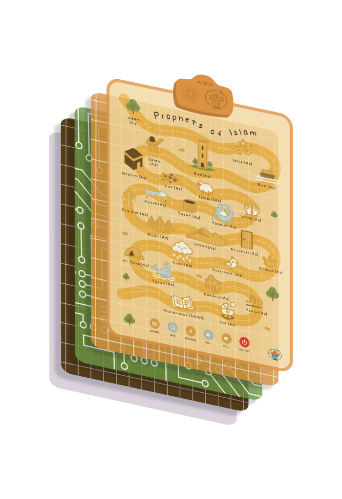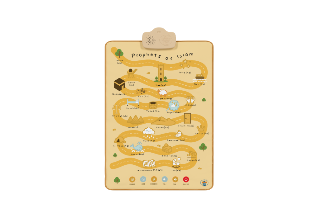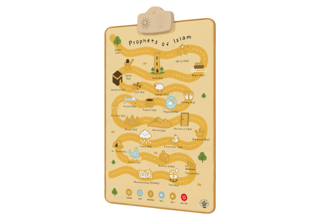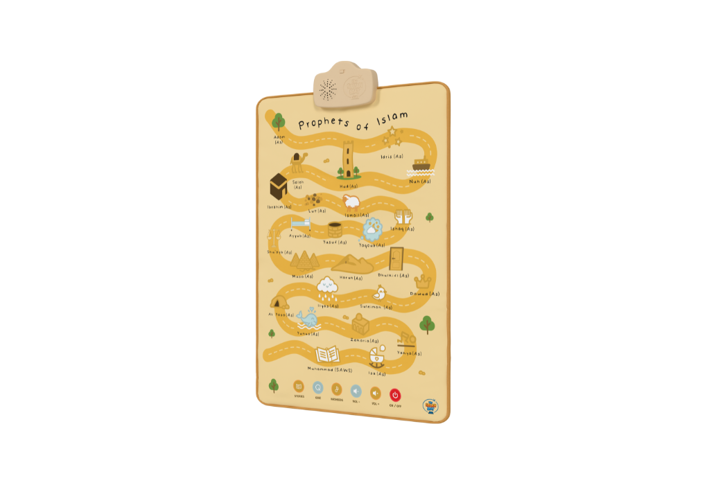 The Prophets of Islam Wall Art teaches children the names and stories of the 25 Prophets through touch and sound. Designed for young learners, it helps parents build their child’s knowledge of Islamic history and love for the Prophets in a fun, interactive way.